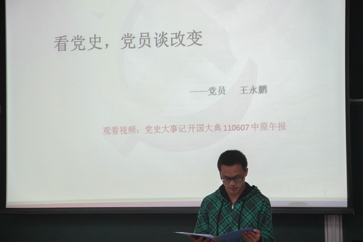 本次活动分为两个部分——“感悟分享,历练成长”与“祈福雅安,时事探讨”。在“感悟分享,历练成长”部分,首先播放了开国大典时的视频,由党员代表王永鹏同学以“看党史,党员谈改变”为主题进行了发言。接下来播放了十八大召开期间的影像画面,预备党员姜思露同学以“十八大,预备党员话感悟”为主题进行了发言,最后播放了五四青年节的相关视频,由岳振宇同学以“五四节,入党积极分子说感想”为主题进行了发言。