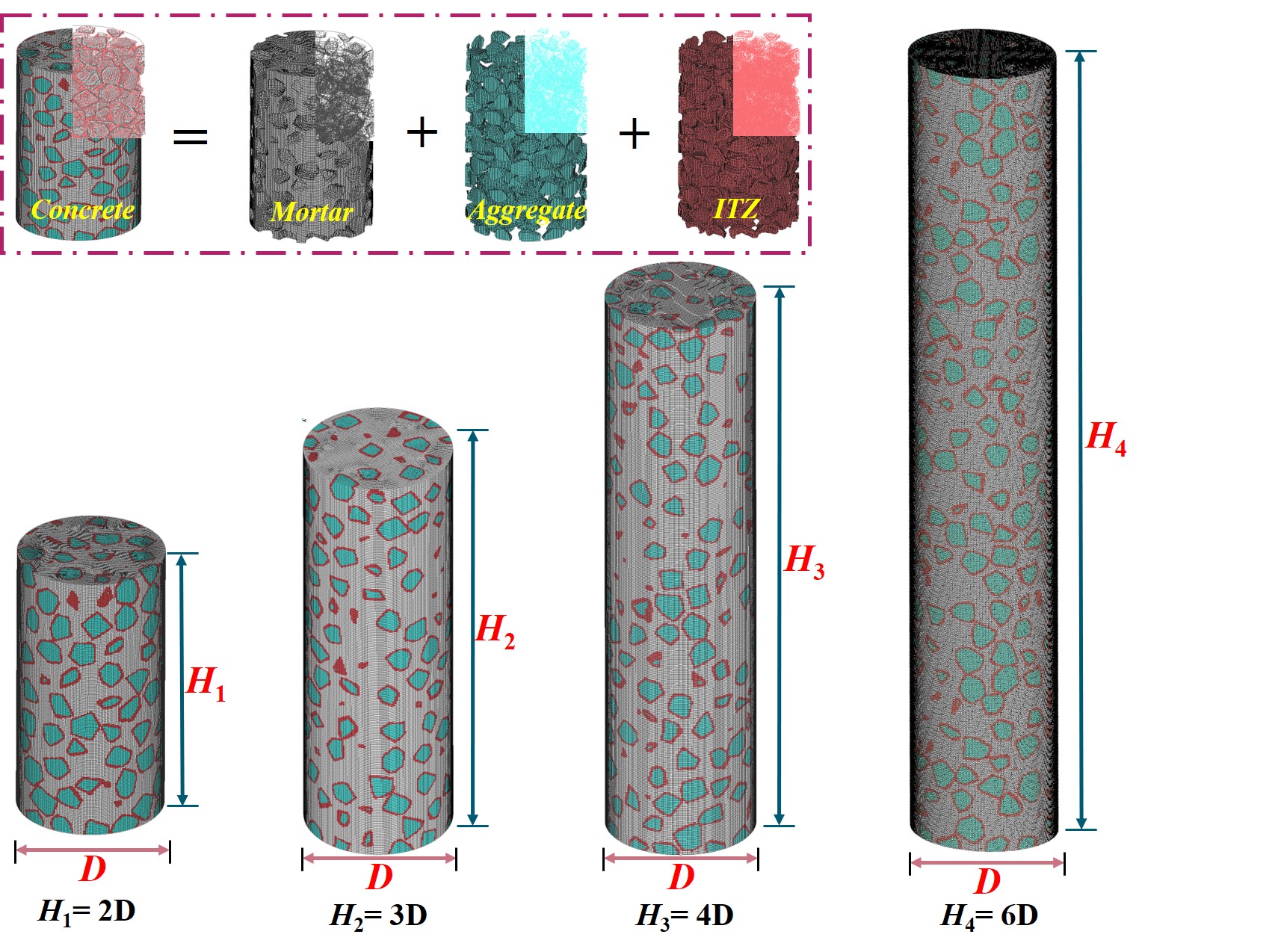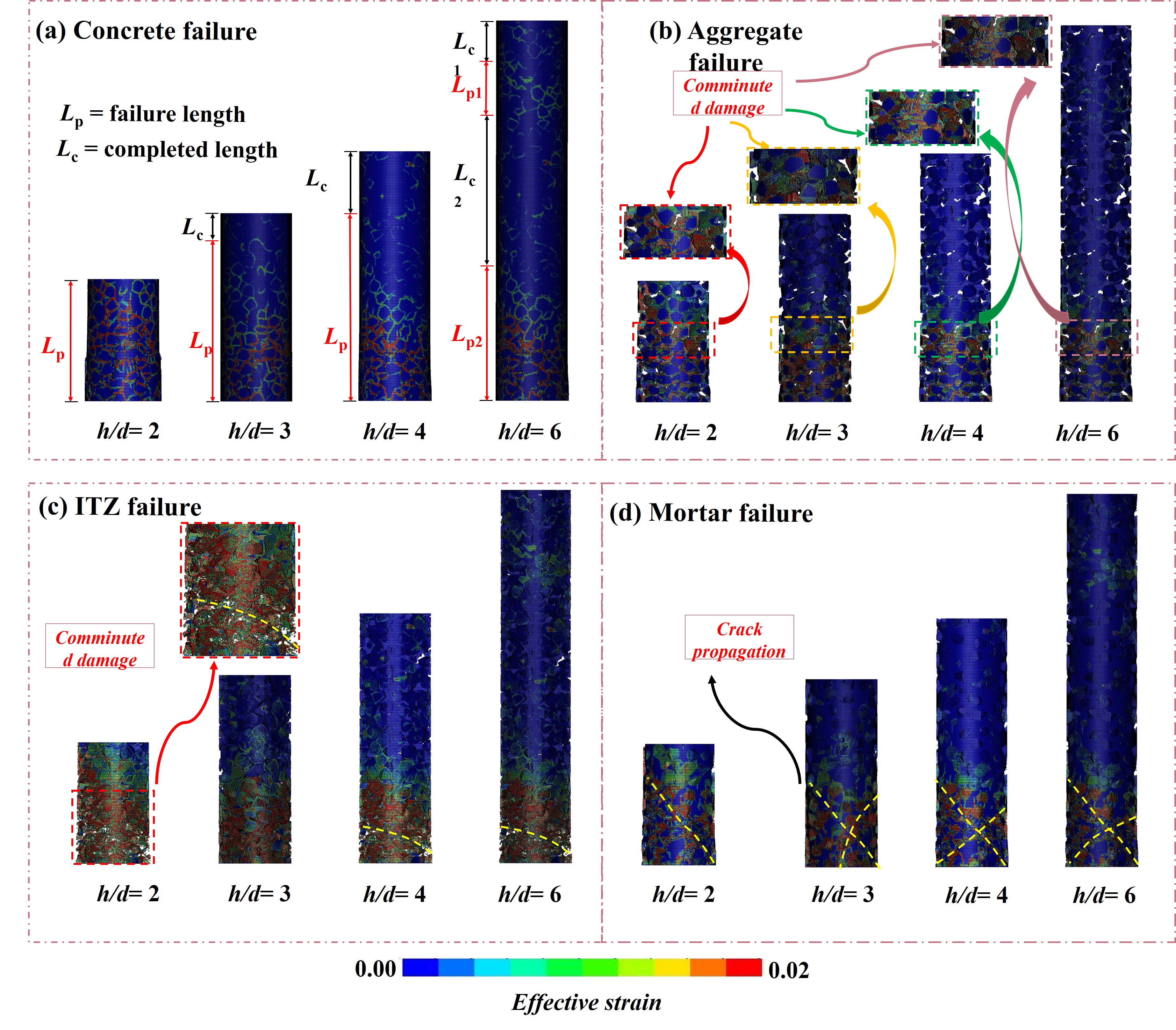 研究人员提出了一种新颖的混凝土3D随机细观模型,对不同高径比珊瑚混凝土试件的静态抗压行为及破坏机理进行了研究。研究发现珊瑚混凝土的单轴抗压强度和应力应变曲线均与试件高径比有关,随着高径比的增大,峰后应力应变曲线变得更陡,表现出明显的局部破坏行为。较短试件的破坏速度更快,而较长试件的表面裂纹沿着试件侧面不断扩展。上述研究结果对于珊瑚混凝土结构分析具有一定的指导意义和工程价值。