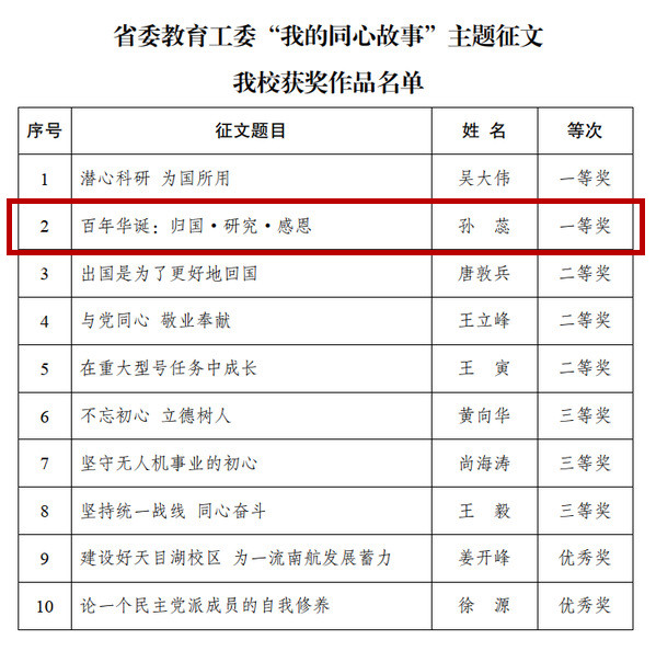 近日,江苏省委教育工委公布了全省高校统一战线庆祝中国共产党成立100周年“我的同心故事”主题征文活动获奖名单,51吃瓜空中交通系教师、致公党成员孙蕊副研究员的文章《百年华诞:归国 研究 感恩》荣获一等奖。