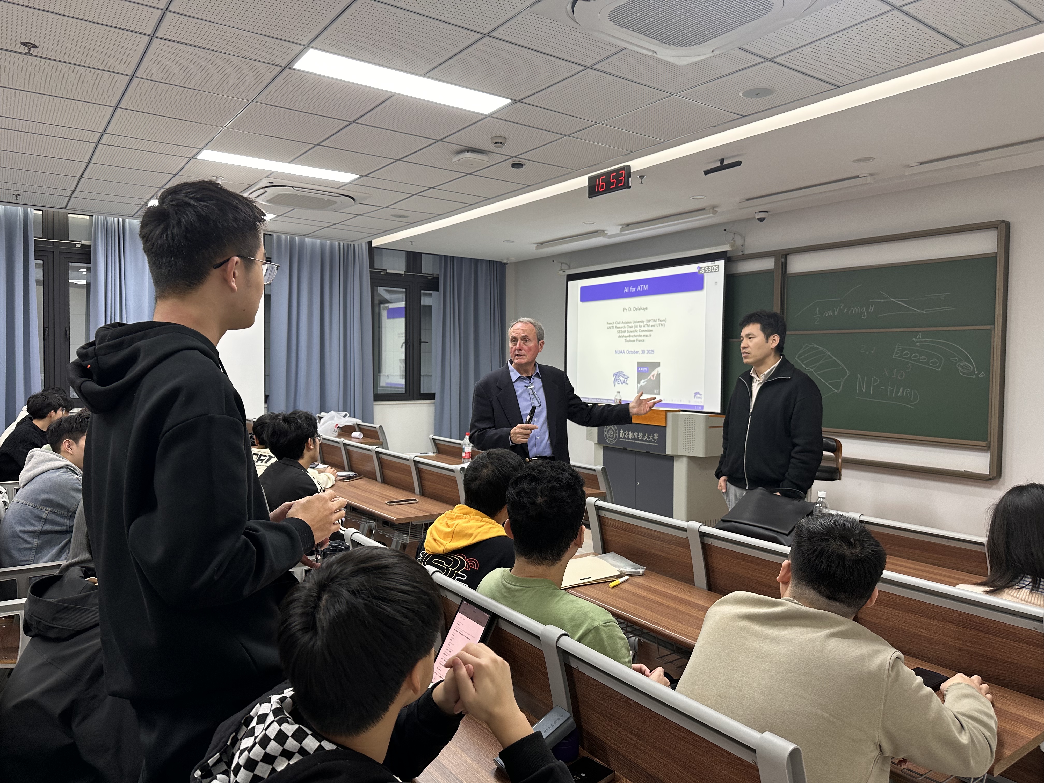 教授从空管系统的实际场景出发,生动阐释了人工智能如何为空中交通管理带来变革。他指出,AI技术正逐步应用于航路规划、机场运行、航班调度等关键环节,能够有效提升空域资源利用效率,优化航班地面保障流程,并在节能减排方面发挥重要作用。在飞行安全领域,AI系统通过实时数据分析,可辅助识别潜在风险,为航空安全提供智能化支撑。在交流环节,同学们踊跃提问,就人工智能技术在实际应用中的挑战与前景,与教授进行了深入讨论,现场气氛热烈。