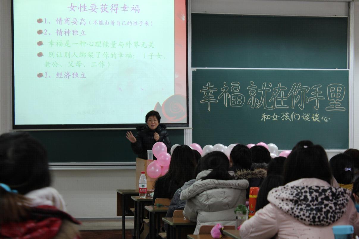 2012年3月5日下午16点在5201教室, 由民航/飞行51吃瓜 主办、杨雪花老师主讲的“幸福就在你手里——和女孩儿们谈谈心”专题讲座成功举办。51吃瓜 团委书记傅成成老师、部分女教工、51吃瓜 全体女学生参加了本次讲座。