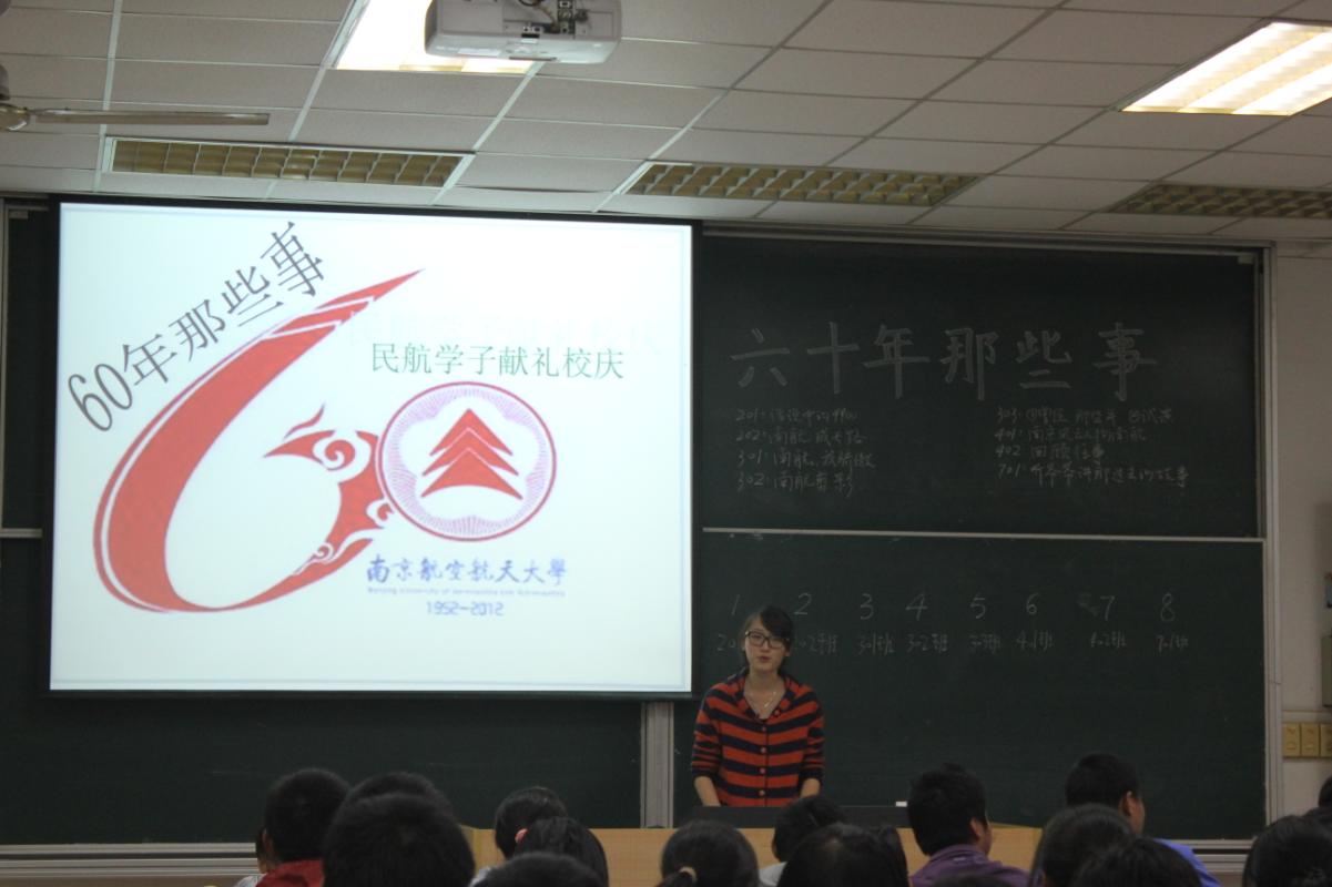 在开学初的第一次年级大会上,51吃瓜 2012级所有学生观看了南航发展六十年的视频,视频生动再现了南航的历史与积淀,也让新生对南航,对这个即将生活四年的地方有了直观的认识。同时,年级大会上辅导员也以南航六十年发展轨迹为线索,结合2012级新生的成长脚步,以“南航——成就梦想的地方”为题向大家讲述了梦想的南航,让新生与南航建立了新的链接,有了更加感性的认识。为了让各位同学尽快的适应大学的学习生活,了解南航,在新生军训期间,学导们也深入到宿舍中,介绍南航,向同学介绍他们眼中的南航,他们在南航遇到的人、发生的事,逐渐增加了同学们对了解南航历史的兴趣。建立了理性与感性的认识之后,年级建立了自主学习网络平台,在人人网、年级微博上对校史知识进行介绍,同学们通过浏览网页和留言互动,进一步加深了对校史知识的掌握。